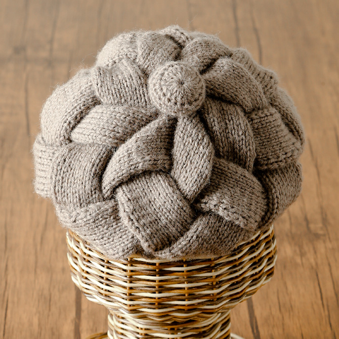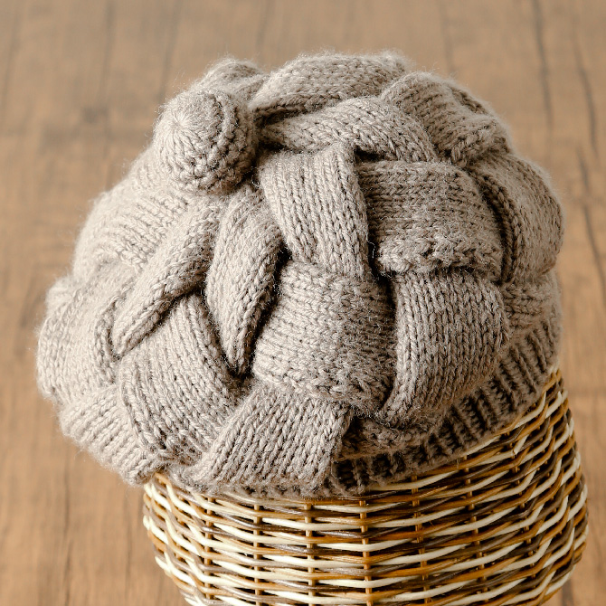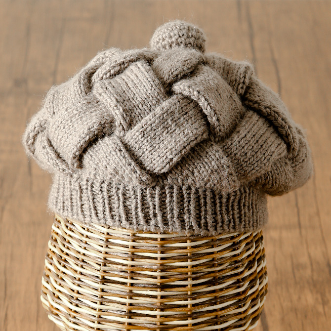 正方形でポコポコとした編み模様のボンボン(ポンポン)付きのニット帽です