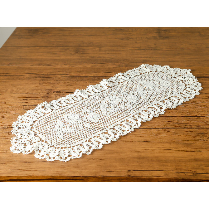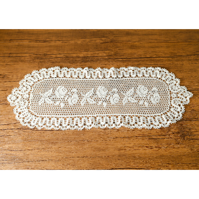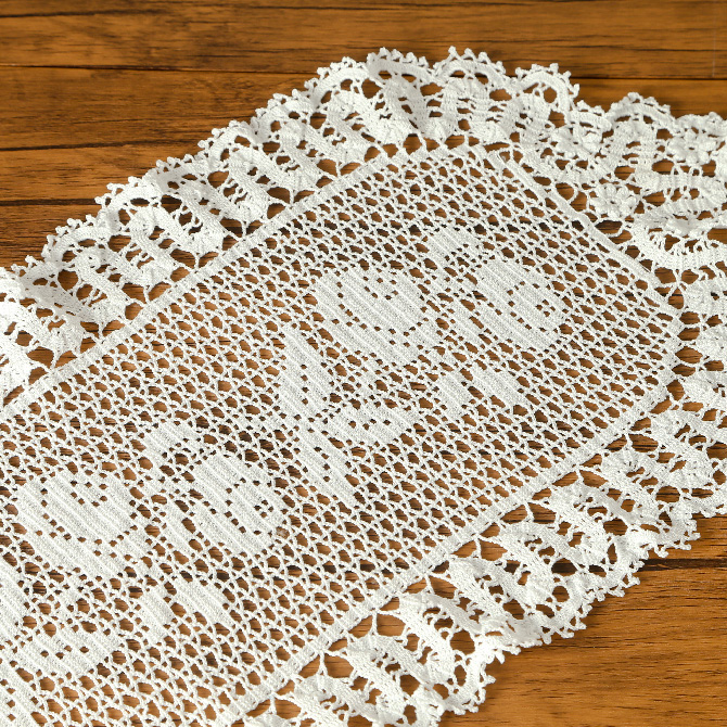 バラ模様を中心にあしらい、周りのフリルはブリュゲール編みで、ゴージャスな雰囲気に仕上げました。